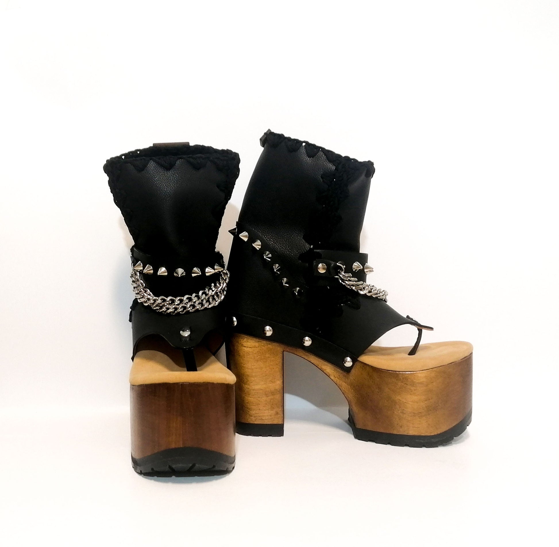 Lo que distingue a estos zapatos son los elementos decorativos. Presentan tachuelas plateadas en el talón y la parte delantera, junto con cadenas y púas para un diseño de inspiración punk. Las botas Punk de Sol Caleyo son una creación exclusiva y llamativa que será una declaración de moda audaz.