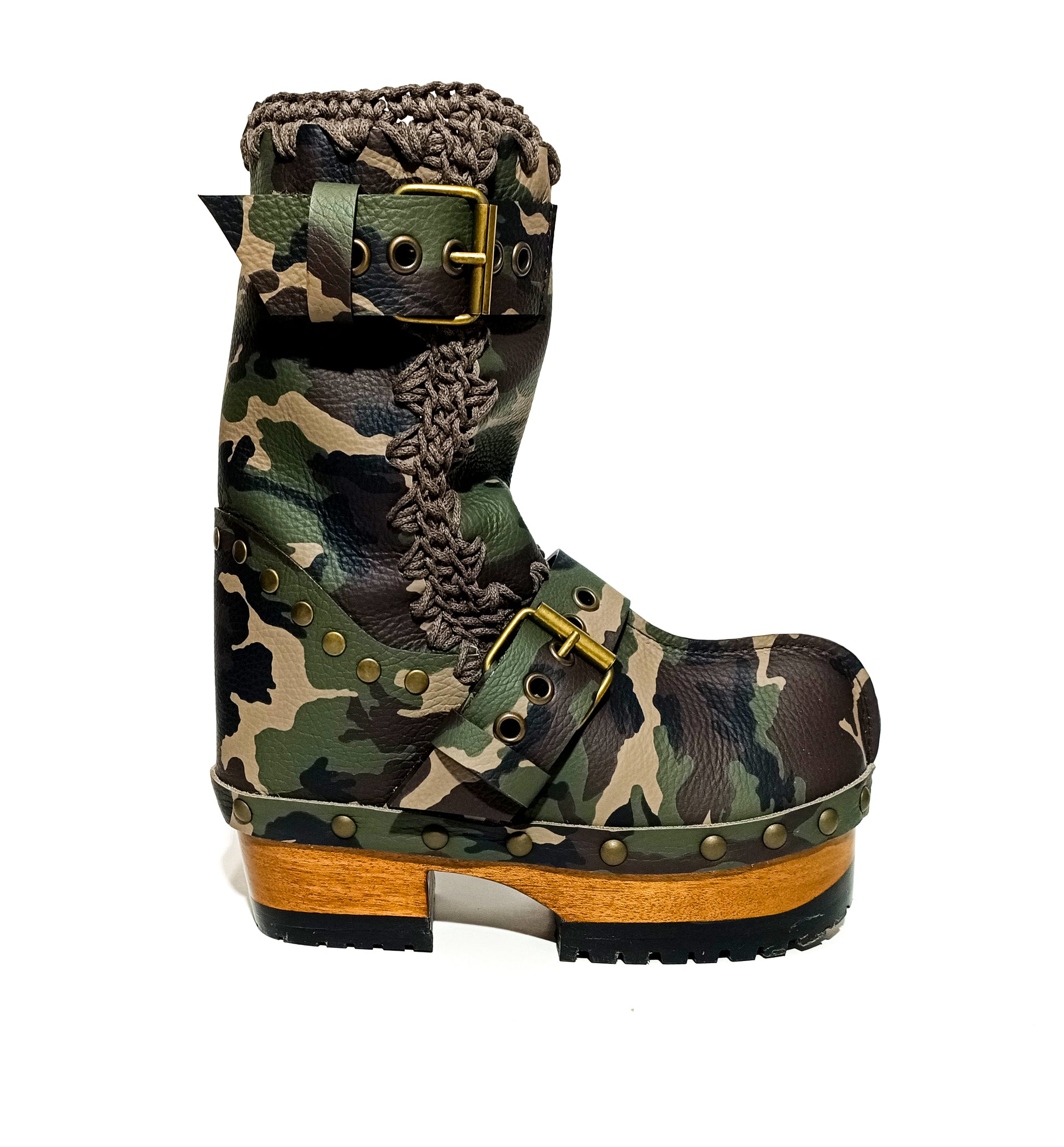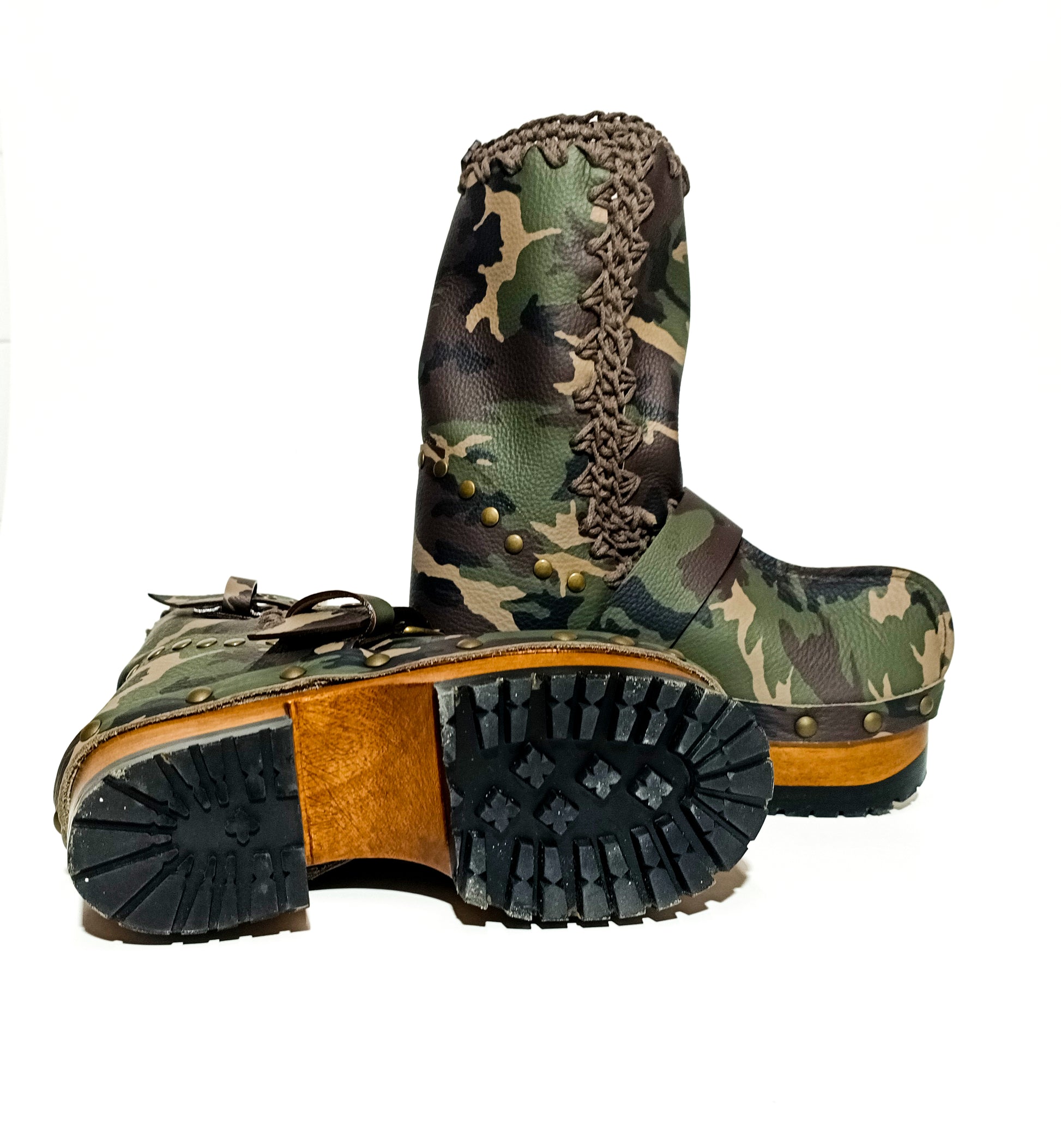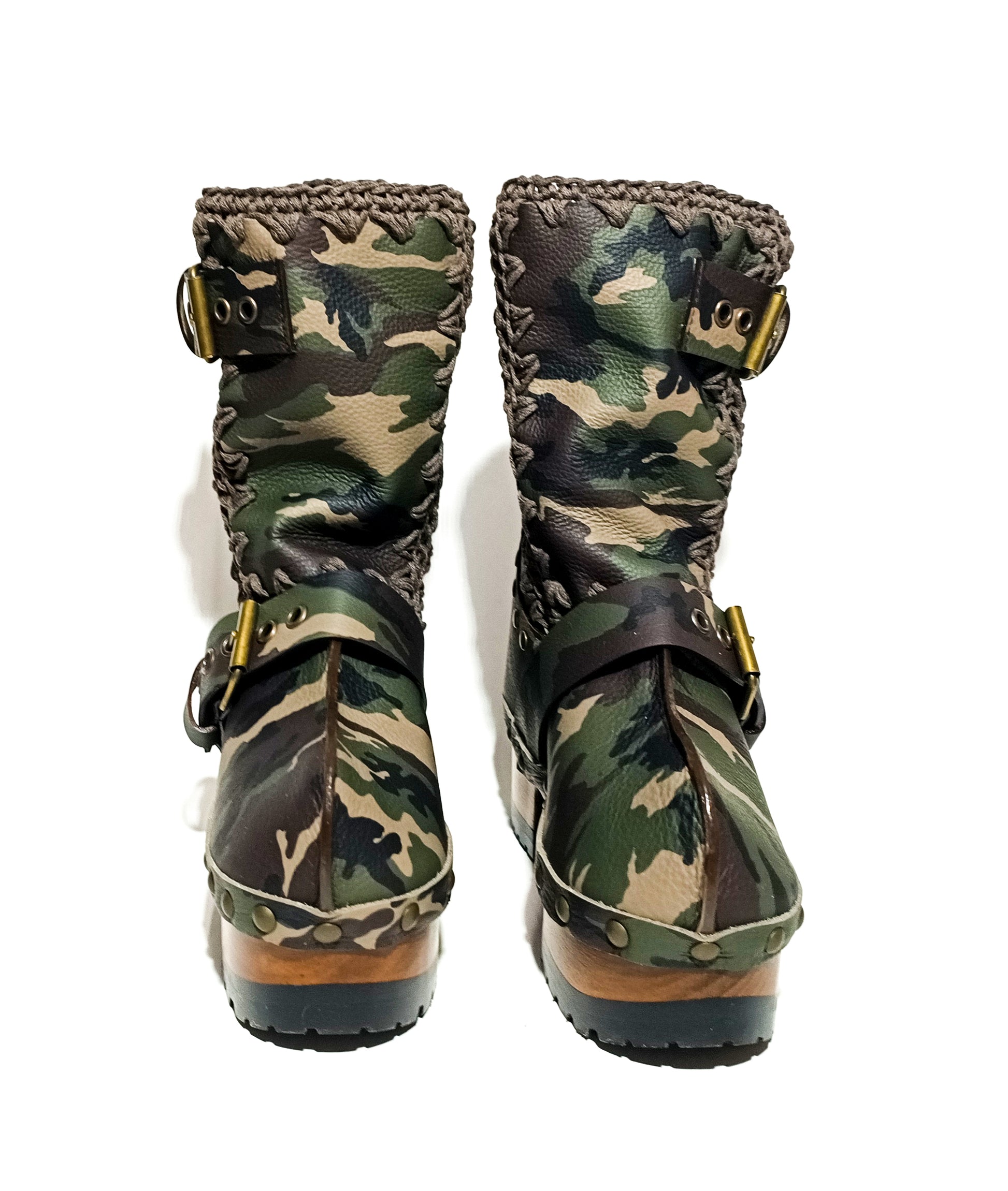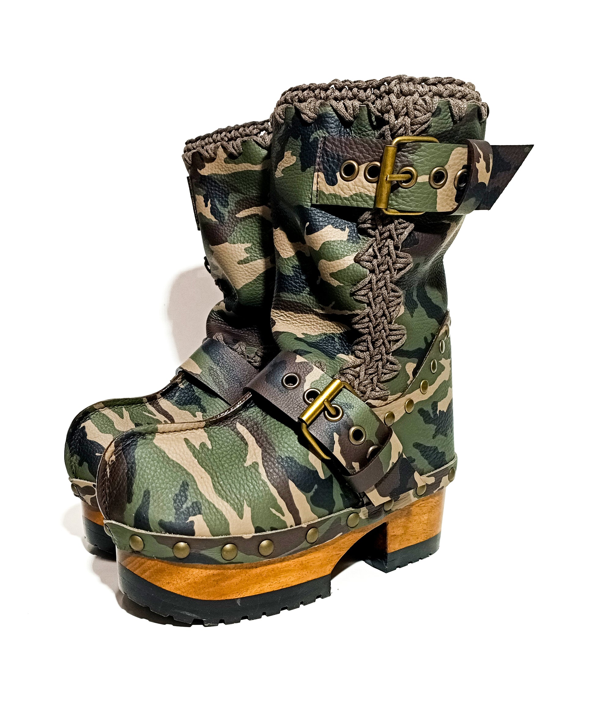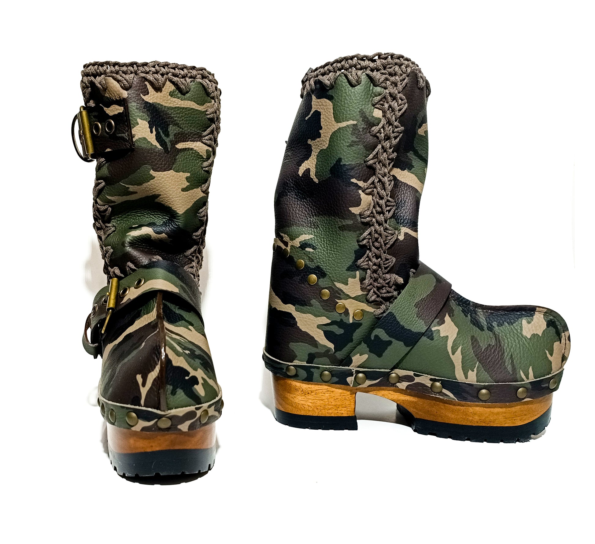 Elegancia atemporal: confeccionadas en auténtica piel de camuflaje, estas botas están forradas en piel natural y adornadas con remaches en el talón y hebillas de oro antiguo. Exudan un aire de elegancia atemporal que complementa cualquier conjunto.