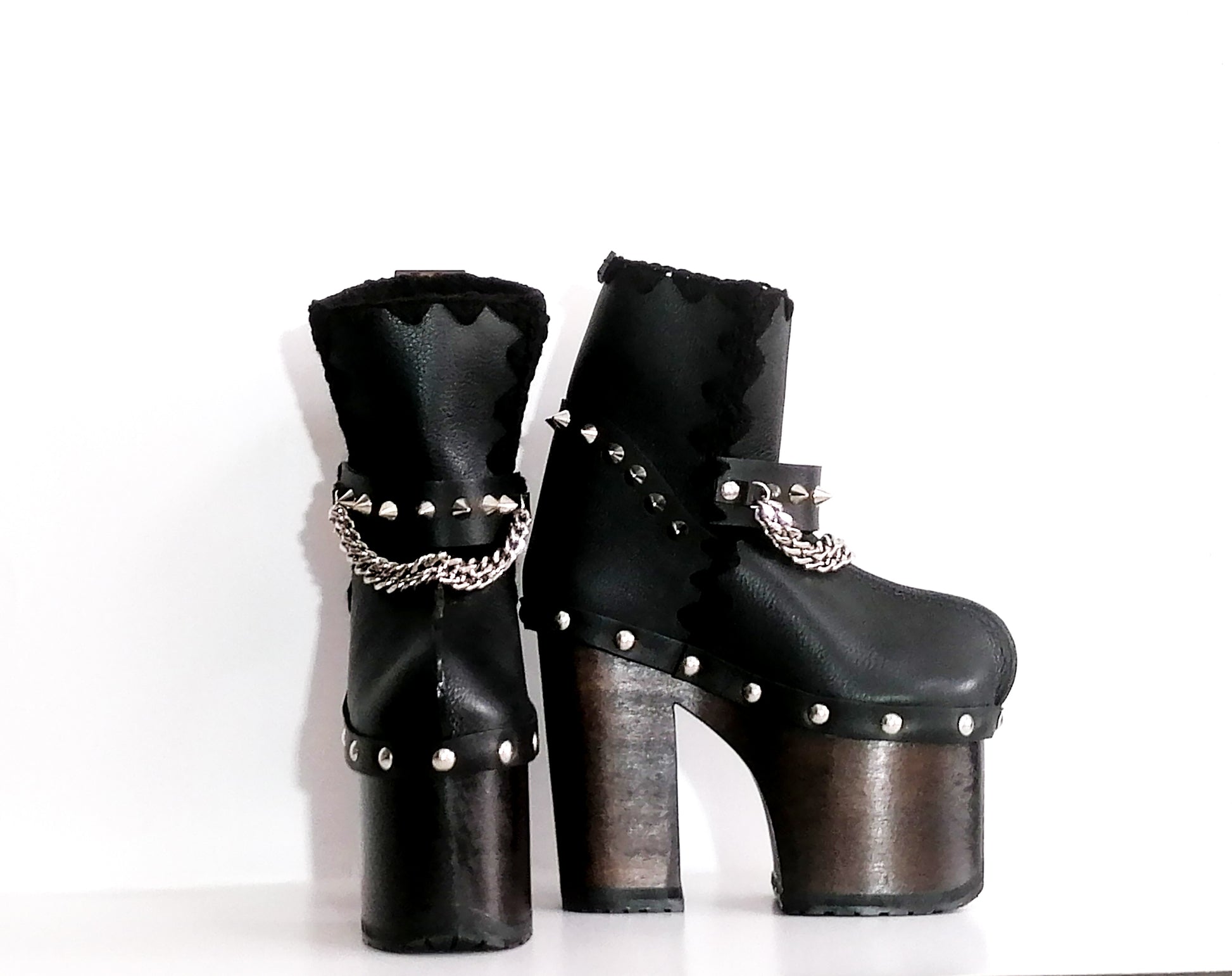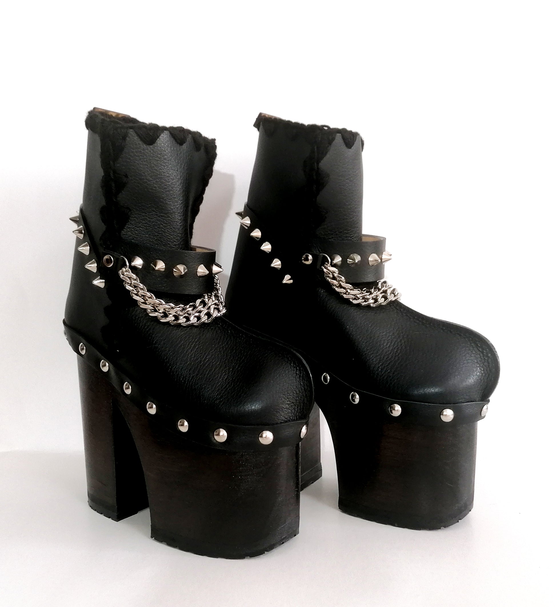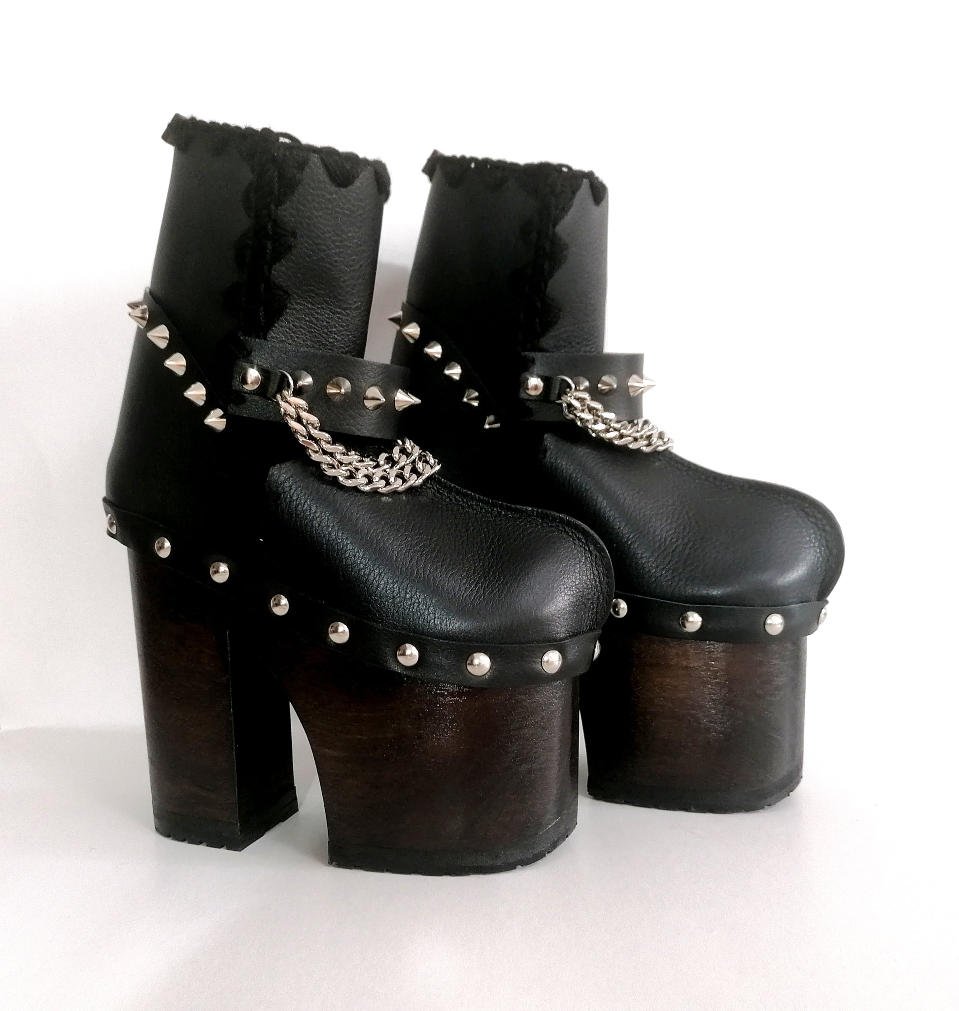 Diseño único: Sol Caleyo se inspira en el estilo icónico de Lady Gaga y adorna estas botas con tachuelas plateadas en forma de pirámide en el talón y la parte delantera, junto con cadenas. Este diseño exclusivo distingue estas botas y las convierte en una pieza llamativa.