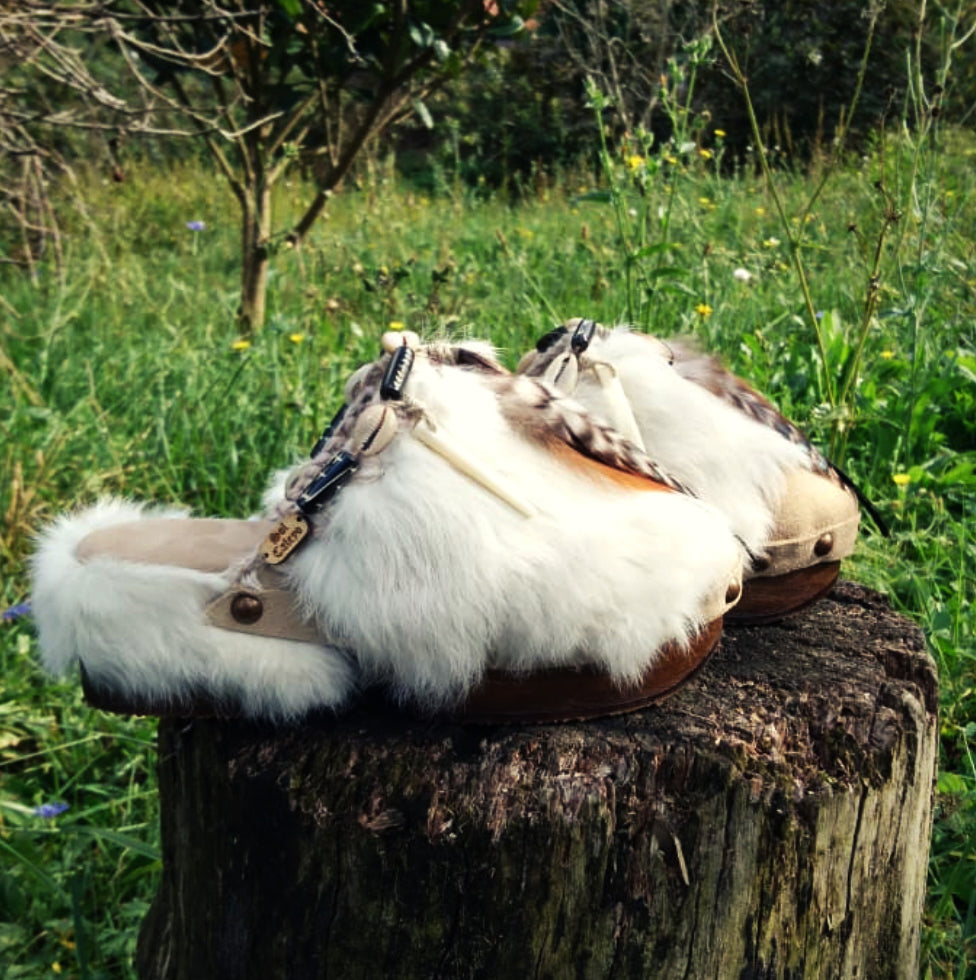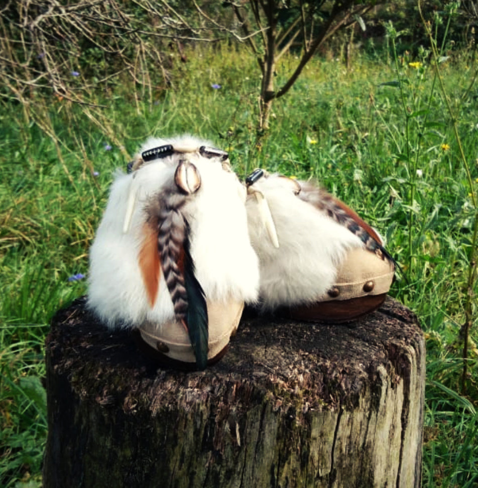 Materiales exquisitos : el uso de gamuza de alta calidad, piel de conejo, concha natural, hueso tallado, cuernos y plumas muestra el compromiso de utilizar solo los mejores materiales. Esta combinación de materiales añade un toque de lujo y singularidad a cada par.